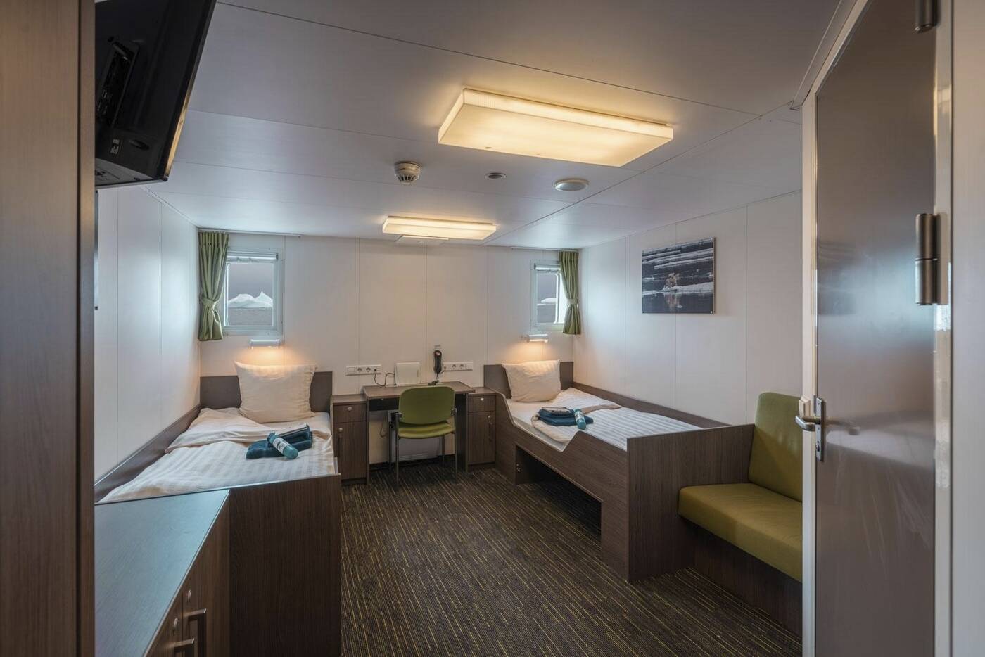 - Kat. C = Zweibettkabine | Deck 5 // Zwei untenstehenden Betten, Dusche/WC, Fenster, Schreibtisch, Stuhl
