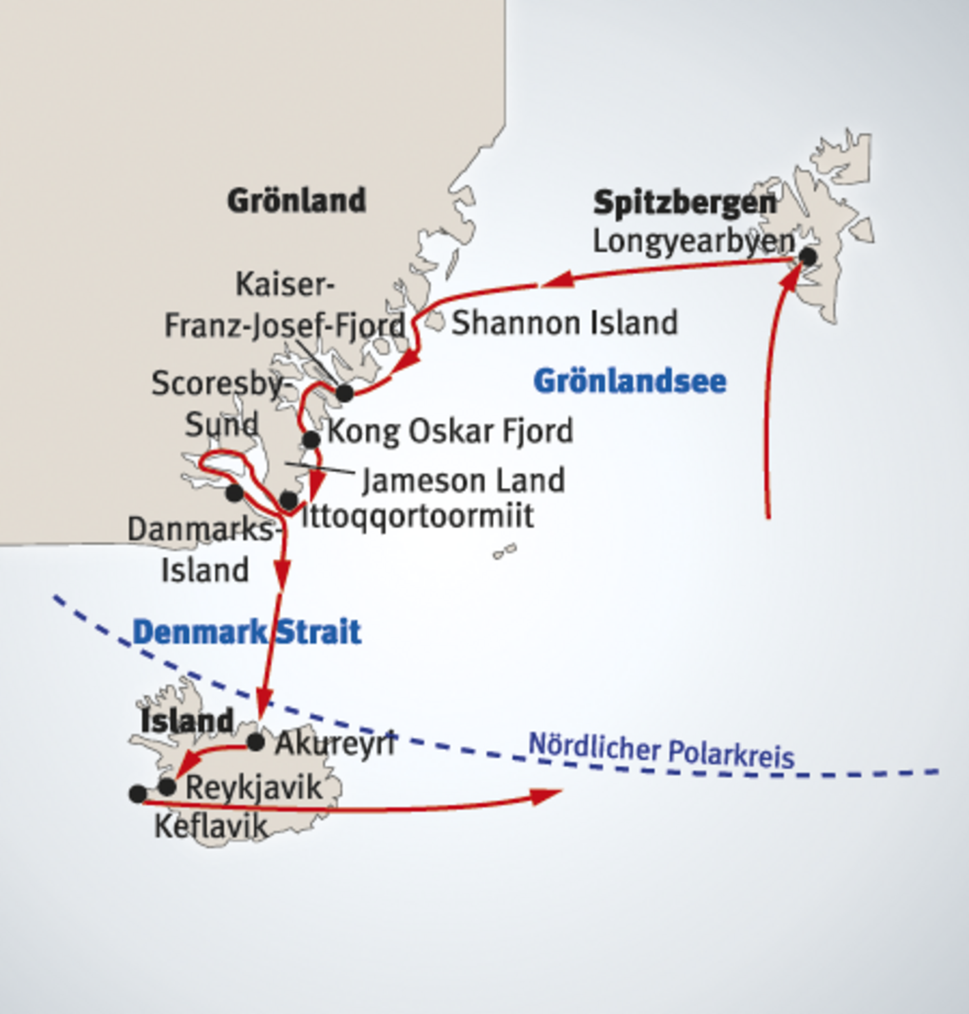 Diese Expeditions-Kreuzfahrt beginnt auf einer der nördlichsten Inselgruppen im Nordpolarmeer, auf Spitzbergen. Die Küste ist geprägt von hohen Bergen und tiefen Fjorden, an deren Ende unzählige Gletscherzungen bis ans Meer reichen und Abbruchkanten steil aus dem Wasser aufragen. Die hiesige Tierwelt ist reich an Seevögeln. Wir fahren entlang der Packeisgrenze nach Grönland. Der genaue Kurs hängt stark von den Eisverhältnissen ab. Unser Ziel ist die raue Küste Ostgrönlands. Das gewaltige Fjordsystem und die beeindruckende, meist menschenleere Küstenlinie werden uns in ihren Bann ziehen. In den tiefen Meeresarmen sichten wir Robben und - mit Glück - auch Eisbären.