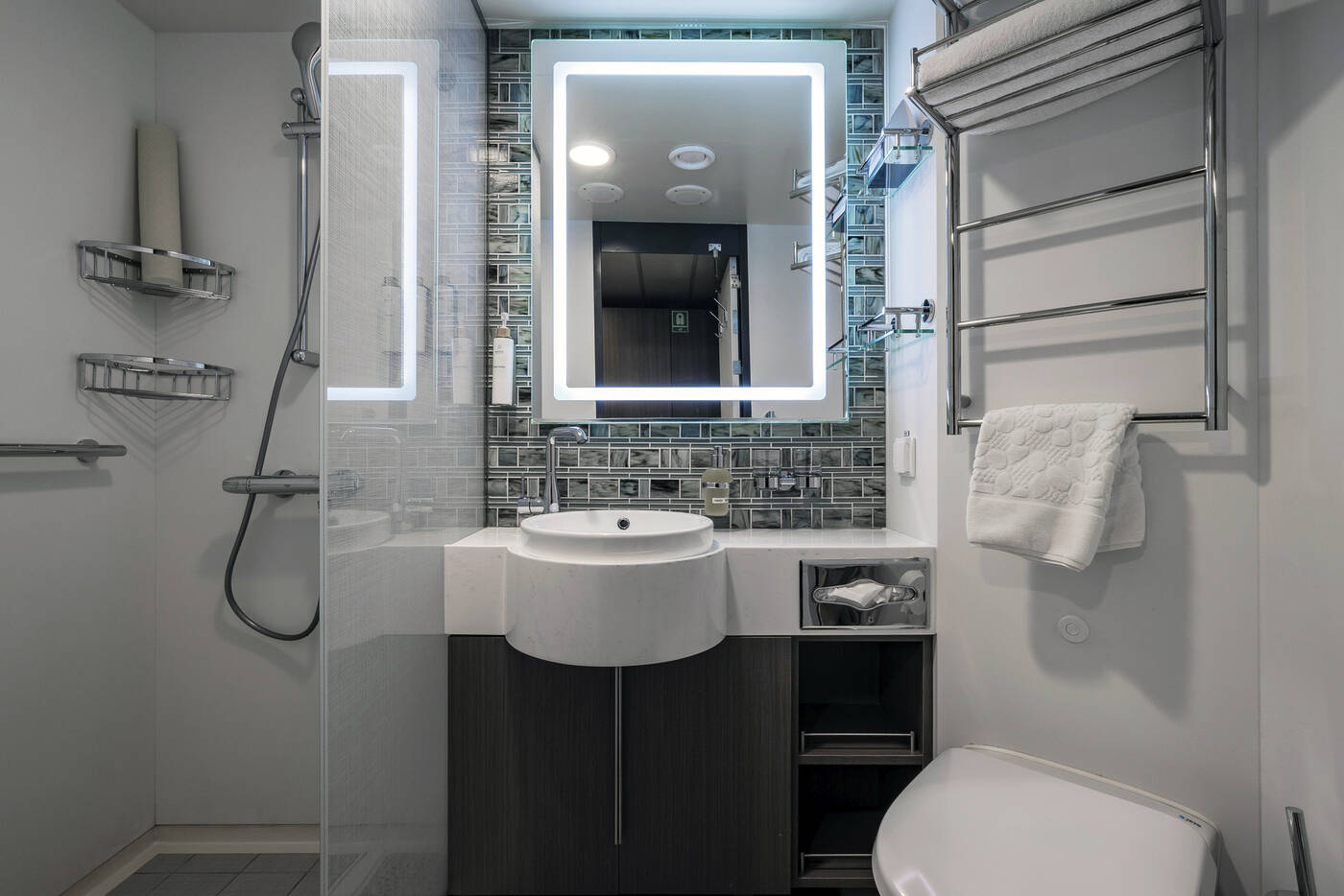 • Kat. G = Junior Suite, Deck 7, Doppelbett oder zwei Einzelbetten, Du/WC, TV, privater Balkon, 38 m²