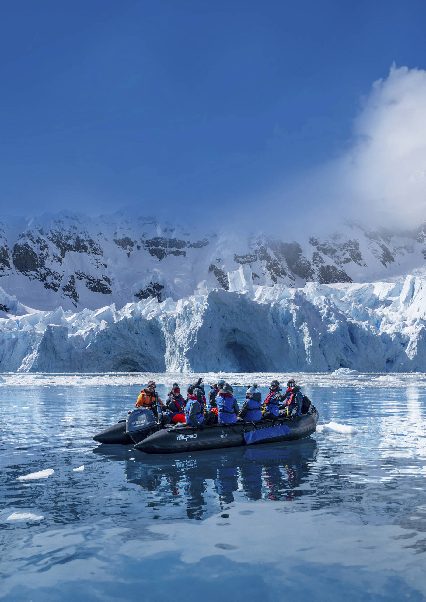 Im Allgemeinen unternehmen wir zweimal täglich Landgänge oder Zodiac-Ausflüge. Wir werden uns warm einkleiden, bevor wir in die Zodiacs steigen, die uns entlang spektakulärer Eis-Klippen oder zwischen gewaltigen Eisbergen führen. Dabei halten wir Ausschau nach Walen, Robben und Pinguinen, die fröhlich durch das Wasser flitzen. Die Zodiacs bringen uns auch vom Schiff an Land, wo wir Pinguinkolonien besuchen, historische Hütten entdecken und einige unserer Lieblingsorte entlang der Halbinsel erkunden können.